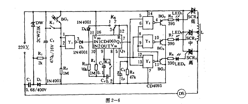 當(dāng)CD4060構(gòu)成的振蕩器經(jīng)Q4、Q5輸出脈沖,經(jīng)Y2~Y4輸出低電平時(shí),對(duì)應(yīng)的BG2~BG4導(dǎo)通,k㈣SCR雙向可控硅導(dǎo)通,電風(fēng)扇運(yùn)轉(zhuǎn)。K1和BG1用作手控或光控。K3是定時(shí)控制開關(guān)。K2是用來改變振蕩頻率的開關(guān)。K2斷開時(shí)振蕩頻率較高,閉合時(shí)頻率較低。