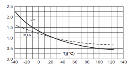 維持電流IH是從導通狀態(tài)轉(zhuǎn)變到阻斷狀態(tài)時,所必需的最小主電流。與結(jié)溫有關(guān),結(jié)溫越高,則IH越小。