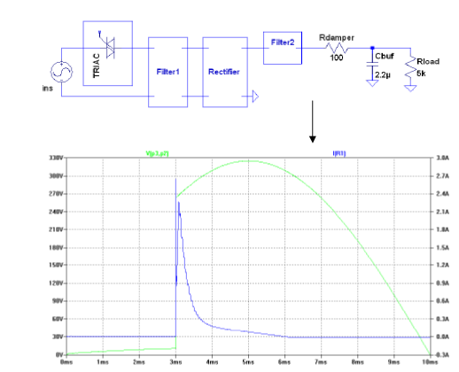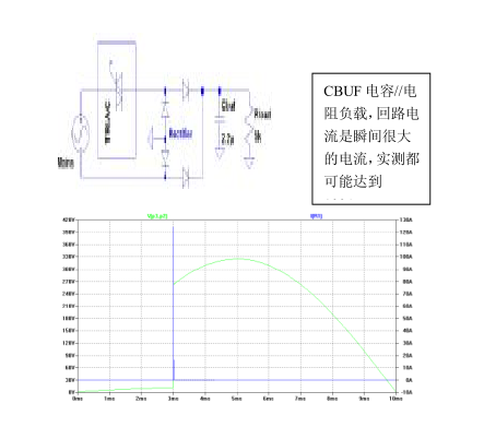 為什么要用 RDAMPER 電阻,RDAMPER 電阻不僅可以抗擊回路開通瞬間的沖擊電流,還可以防止回路中 CBUFFER 電容充電過快而可控硅意外截止,導(dǎo)致不斷重啟,但是 CBUFFER選取也有要求,必須折中,先參考如下波形圖: