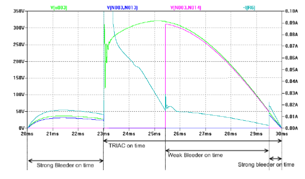 主要由 RSBLEED,RWBLEED,WEAK BLEEDER CONTROL 電路組成,WEAK BLEEDER 回路的主要任務(wù)是檢測整個(gè)回路電流,如果電流少于一定值(也就是根據(jù)可控硅設(shè)定的保持電流大小而定),RWBLEED 導(dǎo)通,開始拉電流保持可控硅導(dǎo)通,具體工作時(shí)序可以參看如下圖: