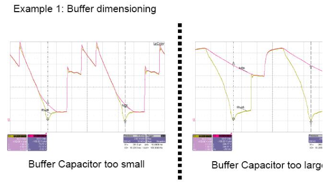 A. CBUFFER 電容太小,會導(dǎo)致開通瞬間電容很快充電,然而后面的 PWM 還沒有建立,直接導(dǎo)致可控硅保持電流不夠,從而導(dǎo)致可控硅關(guān)斷,就出現(xiàn)上面的左邊波形,不斷關(guān)斷重啟現(xiàn)象;