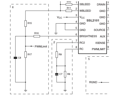 -C7 為充電電容,其值大小可以影響頻率的大小,內(nèi)部恒流源對 C7 在 1US 時(shí)間左右充滿電之后就對 R8,R9 放電,R9 何時(shí)開啟是與 BRIGHTNESS 引腳電壓決定的,此引腳電壓越高 R9開通越早,放電越快,頻率就越高,反之,亦然;-R9:確定最高工作頻率,越小頻率越高,建議工作頻率在 150KHZ 以內(nèi);R8:確定最低工作頻率,越小,最低工作頻率越低,視客戶應(yīng)用情況而定;