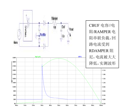 FILTER/電容//電阻/RDAMPER串聯(lián)負(fù)載,回路電流受到RDAMPER 和 FILTER 電感阻尼,電流被大大降低,由于有電感的存在,電流先上升后才降落,這種電路就是 SSL2101 的實(shí)際使用電路模型,實(shí)測波形如右圖所示;