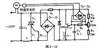 圖2—15所示電路是由雙向可控硅與單結(jié)晶體管組成的控制電路。利用轉(zhuǎn)速發(fā)電機進行反饋以維持馬達轉(zhuǎn)速穩(wěn)定。 電源經(jīng)D1~D4組成橋式整流電路,R1與穩(wěn)壓管DW構(gòu)成穩(wěn)壓電路,供給單結(jié)晶體管等的工作電壓。此電壓經(jīng)電阻R2、R4及W分壓作為基準(zhǔn)電壓es。轉(zhuǎn)速發(fā)電機產(chǎn)生一個與主馬達轉(zhuǎn)速成比例的電壓,經(jīng)D5~D6整流,再經(jīng)C,濾波,在電阻R3上產(chǎn)生一反饋電壓cv。因此.在電容C1上的控制電壓為基準(zhǔn)電壓與反饋電壓之差,即ec=es-eV,用ev。去控制單結(jié)管BT