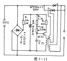 圖1一11所示的交流調(diào)壓器電路采用單結(jié)管弛張振蕩電路觸發(fā)單向可控硅進(jìn)行交流調(diào)壓。該電路是將220V交流電整流后經(jīng)R1,DW降壓穩(wěn)壓至18V供BT33作工作電源。省去了觸發(fā)線路的電源變壓器,這樣使得輸出脈沖前沿和后沿都較陡.移相范圍較寬.電壓調(diào)整范圍也增大了。