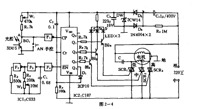 圖2--4具有高、中、低三檔速度調(diào)節(jié)??梢杂檬挚匾嗫捎檬蛛娡策M(jìn)行光控。其工作原理為:AN未按下且無光照時,A點(diǎn)高電平,F(xiàn)1輸出低電平,IC2不計數(shù)。當(dāng)按下AN或光照BG1時,A點(diǎn)低電平,F(xiàn)1輸出高電平注入IC2的計數(shù)輸入端CP,IC2開始計數(shù)。ICl構(gòu)成的時鐘脈沖發(fā)生器產(chǎn)生的脈沖信號輸入EN端,Q0~Q4依次輸出高電平,BG2~BG4按順序?qū)ǎ琒CR1~SCR3雙向可控硅按順序被觸發(fā)。觸發(fā)信號在每個檔位停留三分鐘。當(dāng)達(dá)到滿意風(fēng)速時切斷光源和放開AN,A點(diǎn)高電平,IC2的輸出維持高電平,風(fēng)扇轉(zhuǎn)速被鎖定。在每一次接通電源瞬間