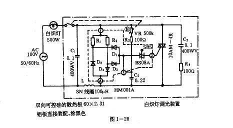 圖1--28所示的調(diào)光器,使用HM001A模塊控制(虛線框內(nèi)是HM 001A模塊內(nèi)部電路),電路非常簡(jiǎn)單。HM001A內(nèi)部包括SBS觸發(fā)器和消滯電路。調(diào)節(jié)可變電阻VR即可改變SCR雙向可控硅的導(dǎo)通角實(shí)現(xiàn)調(diào)光。C3及R4構(gòu)成降噪電路。C1和L線圈用來(lái)濾波,減少對(duì)電源的干擾。