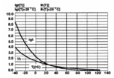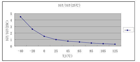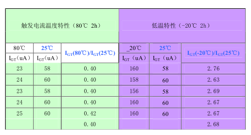 I GT (80 ℃)/I GT (25 ℃) ≥0.3 以及 I GT (-20 ℃)/I GT (25 ℃) ≤4.5正是因?yàn)榭煽毓璧臏囟忍匦圆睿拗屏耸褂谜呤褂每煽毓璧臏囟?/span>范圍,同時(shí)也限制了選擇可控硅觸發(fā)電流的范圍。因此,一般客戶選擇觸發(fā)電流中間范圍的 30-60uA 以適應(yīng)高低溫環(huán)境變化的應(yīng)用要求。