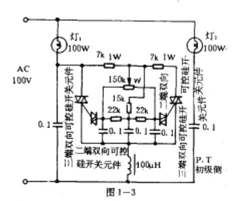 圖1一3所示的電路,是使兩盞電燈交叉調(diào)光。當(dāng)調(diào)節(jié)W時(shí),一盞燈由暗變亮,而另一盞燈則由亮變暗。其道理是,調(diào)節(jié)W時(shí),其中一只可控硅的導(dǎo)通角由小變大,另一只可控硅的導(dǎo)通角則由大變小。