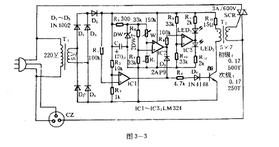 圖3—3采用過零觸發(fā)可控硅的控溫電路。它對電源干擾很小。ICl、BG及T2組成過零觸發(fā)電路。整流后的脈動電流輸入ICl反相輸入端,在電流過零時ICl輸出一個電脈沖到BG的基極。這時BG飽和導通,其余時間BG截止。在T2次級產(chǎn)生一個脈沖觸發(fā)雙向可控硅導通。IC2、R6、R7、W、R1;組成溫度控制電路。被控溫度低于設定溫度時,IC2輸出高電平,D6反偏截止,不影響觸發(fā)電路。當溫度升高使IC2輸出低電平時,D6導通。待電源過零后,由于t2時刻脈沖被D6短路,SCR可控硅關斷。隨溫度下降,R4阻值增大。IC2輸出高電平(ty時刻),但被D6反偏而阻斷。只有待到t4。時刻ICl輸出脈沖時,SCR可控硅被觸發(fā)導通。從而實現(xiàn)過零開關進行溫度控制。