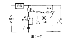 圖1一7中閉合K時(shí),調(diào)壓電路不起作用。這時(shí)負(fù)載得到全功率。斷開(kāi)K時(shí),負(fù)載所得功率被SCR單向可控硅調(diào)壓電路控制。調(diào)節(jié)W可改變C1的充電時(shí)間.也就改變SCR單向可控硅的導(dǎo)通角,負(fù)載取得的功率即受到調(diào)節(jié)。負(fù)載取得的最大功率只是半波整流有效值的95%。本圖可控最大功率約1000W。