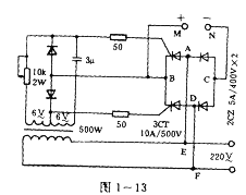 圖1~13所示的電路是用阻容移相觸發(fā)的調(diào)壓電路。M、N輸出直流電。若M、N短接,則從A、E(或D、F)兩端輸出交流。阻容移相可控硅凋壓線路簡單.工作可靠。但脈沖不陡,移相范圍窄.一般只達(dá)l20度。
