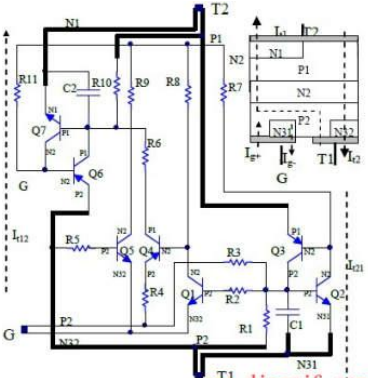 T2 接電源Vt21 正極,T1 接通電源Vt21負 負, 此時當G 極接Vg+ 為正電壓, Q4、 、Q5 、Q6 、Q7 處于反向截止,Q1 的B極 極和 和E 極之間無正偏壓也處于截止狀態(tài),Vg+ 由P2 輸入后經(jīng)R3 使Q2 的B 極和E極 極之間產(chǎn)生正偏電壓而導通,從而促使Q3導通,這時即使撤出Vg+ ,在電容C1的 的的作用下,Q2 、Q3 也仍然能處于導通狀態(tài),只有當Vt21 先反向或撤除才重回截止。當G 極接Vg 為負,Q4 、Q5 、Q6、 、Q7 同樣處于反向截止狀態(tài),Q1 的B 極和E 極之間因Vg 產(chǎn)生正偏電壓而導通,從而使Q3 、Q2 導通并得以保持導通狀態(tài)。? T1 接電源Vt12 正極,T2 接通負電源Vt12 的負極, 此時G 極接Vg 為正, Q1因 因B 極和E 極之間處于反向偏壓而截止,Q3 處于反向截止,Q2 因B 極和E 極之間處于正向偏壓導通而導致Q4 、Q7 的導通,從而Q6 、Q7 導通并保持導通狀態(tài),只有當 當Vt12 先反向或撤除才重回截止。當G極接Vg 為負,Q1 、Q2 、Q3 和Q4 處于反向截止, Q5 的B 極和E 極之間因Vg 而處于正偏導通,從而使Q6 導通,繼而Q7、 、Q6 導通并得以保持導通狀態(tài)。